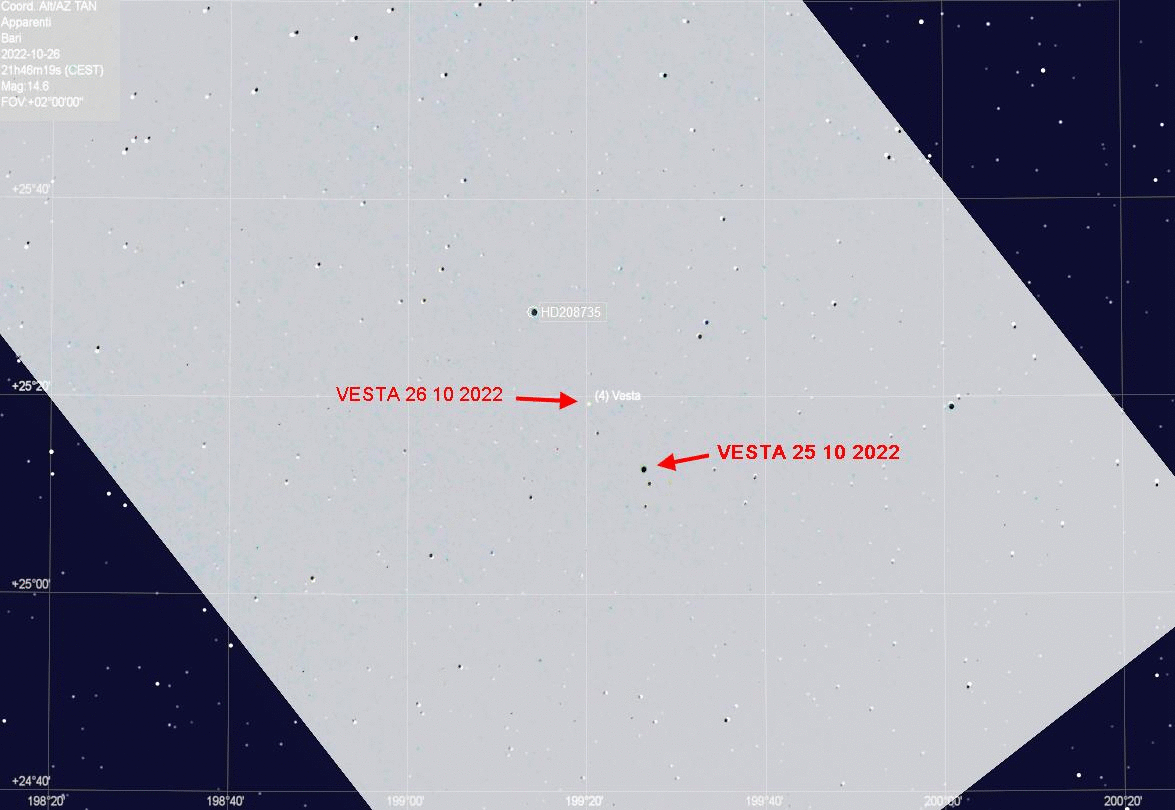 Anche ieri sera 26/10/2022 ho riacceso il mio tele remotizzato ed ho puntato alle coordinate presunte dell' asteroide Vesta, ho fatto una ripresa con i soliti 30 secondi di esposizione e subito ad occhio ho la conferma che Vesta si era spostato rispetto alle riprese della sera precedente. Ho creato una gif composta da due foto animate che mostrano lo spostamento dell' asteroide raggiungibile a questo indirizzo: