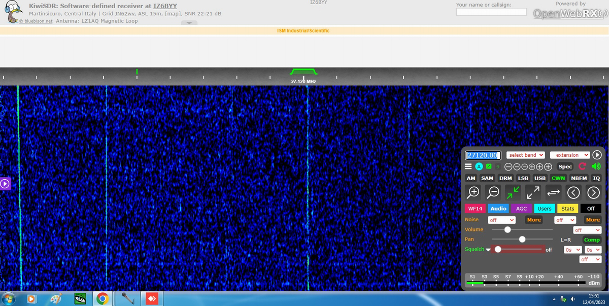 Ho ancora una volta, quest'oggi, effettuato un TEST di emissione Portante radio @ 27.120 MHz. (5W elevati @ 100W out. per pochi secondi, con Antenna 5/8 lambda) da Polignano a Mare centro (Bari) @ Martinsicuro, nelle Marche, dove è allocato un SENSIBILE Grabber (ricevitore comandabile in remoto) della famosa rete mondiale KIwiSDR.