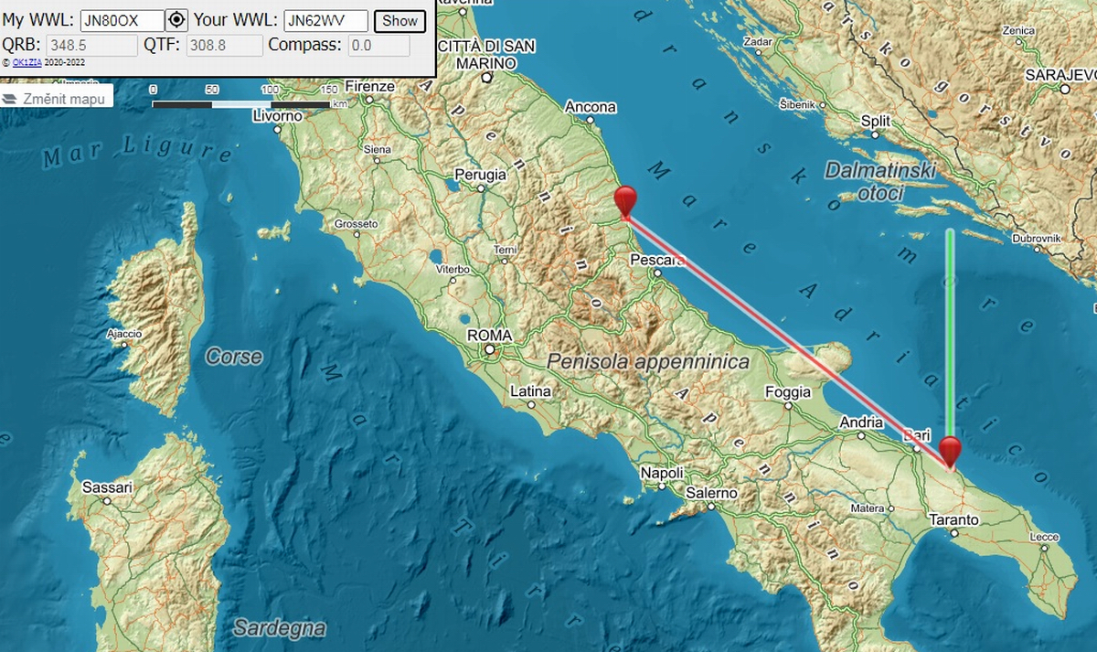 Il QRB (la distanza tra la trasmittente, e la ricevente), è pari @ 348.5 Km. (vedere mappa esplicativa). Il segnale, seppur debole, è giunto.