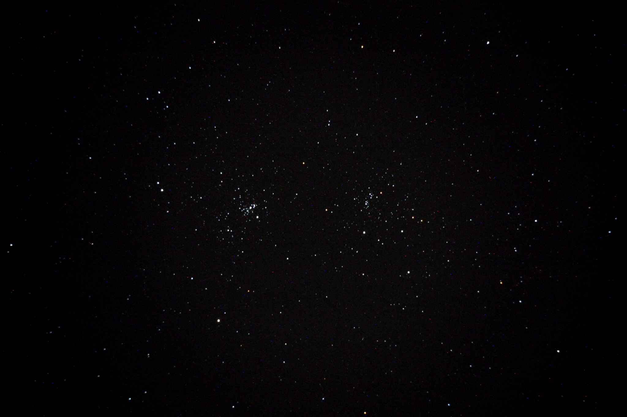 ho tentato alcune prime foto prova pur con cielo pessimo per umidità con la Canon 300D acquistata usata tempo fa, tra le poche acettabili questa dell'ammasso doppio in Perseo che allego, purtroppo vedo una marea di puntini rossi e blu...