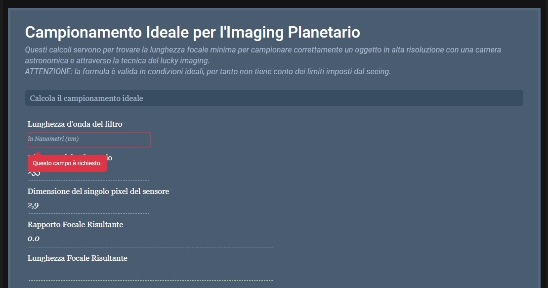 Nell'imaging planetario non si utilizzano i filtri che di solito si usano per il deepsky, salvo in qualche rara occasione. Pertanto non si riesce, da questo sito, a calcolare il campionamento. VEDI ALLEGATO