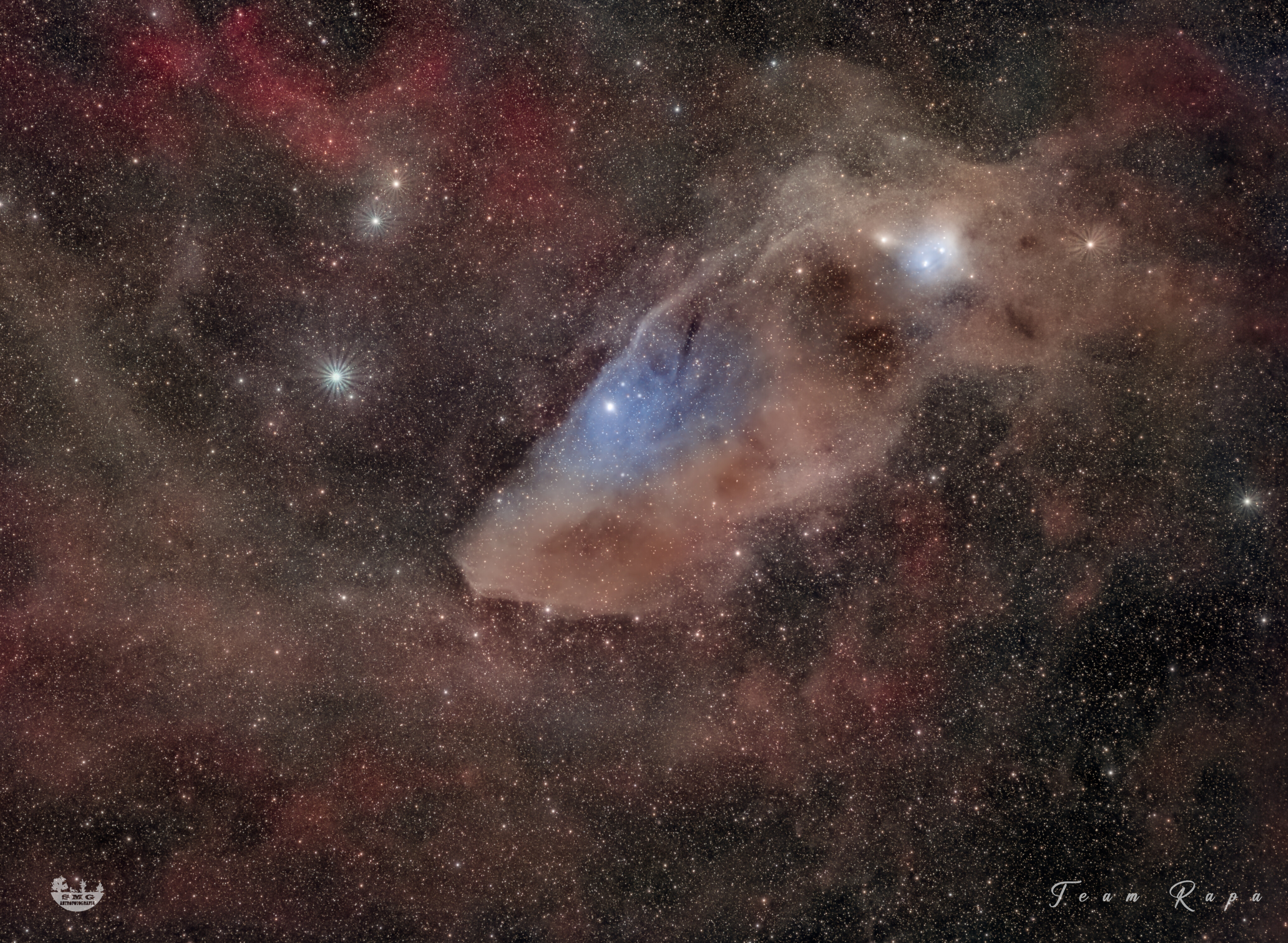 Questa astrofoto è la combinazione di due diverse focali, largo campo fatto con un Samyang 135mm mentre il dettaglio della "testa" è fatto con un rifrattore da 250mm