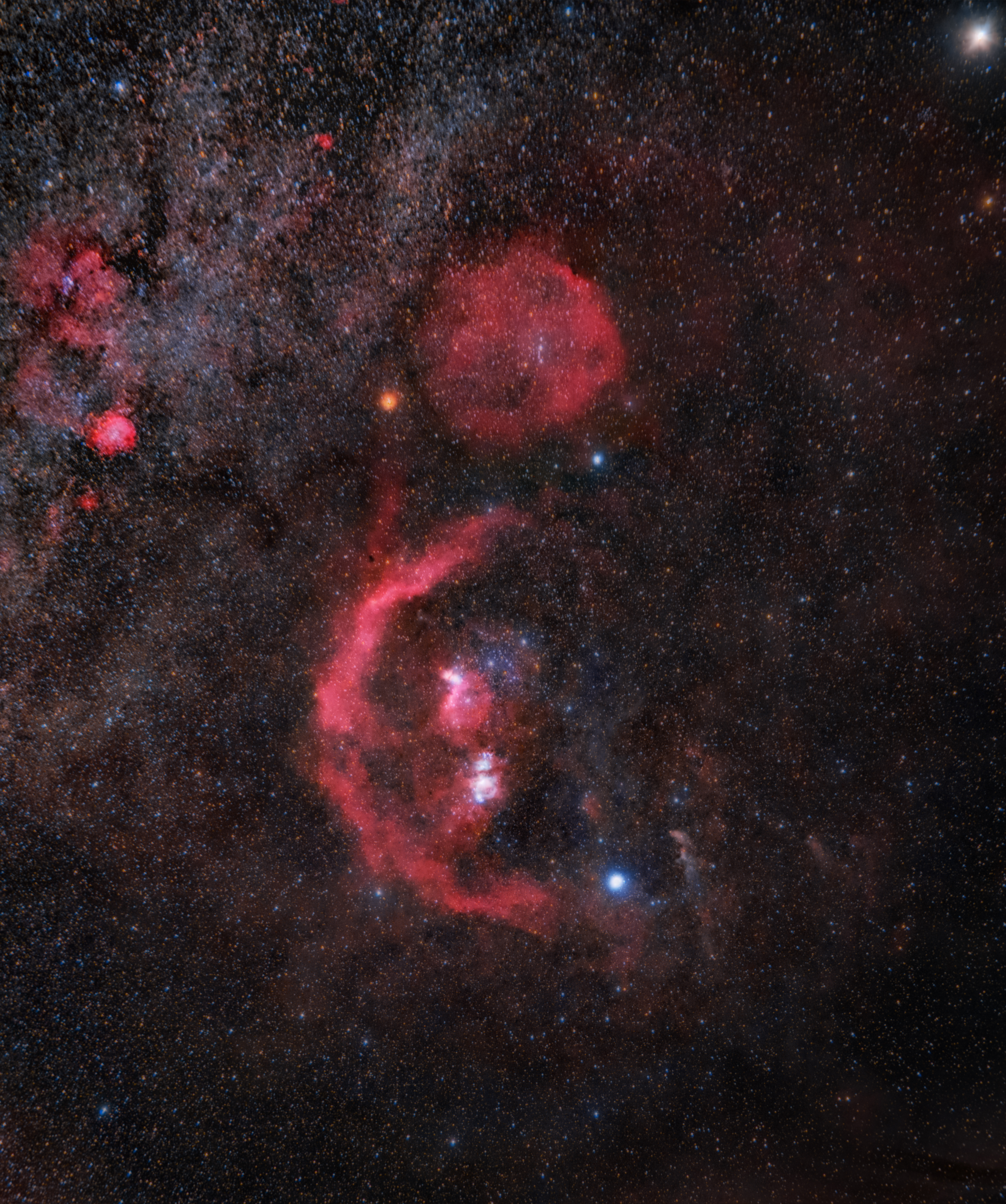 Una delle costellazioni più conosciute e più ricca di stelle brillanti, con oggetti del profondo cielo molto luminosi tra cui la grande Nebulosa di Orione (M42) situata nella spada del cacciatore. L' intera costellazione è avvolta dall'anello di Barnard, un'enorme nube molecolare gassosa che dista dalla Terra circa 1600 anni luce.