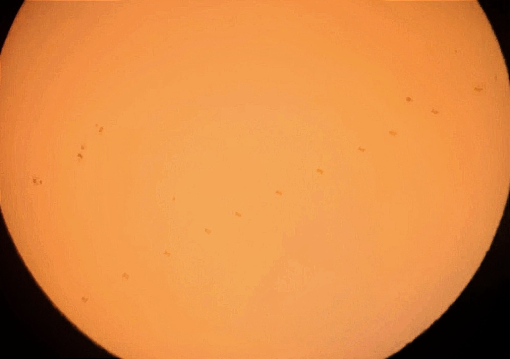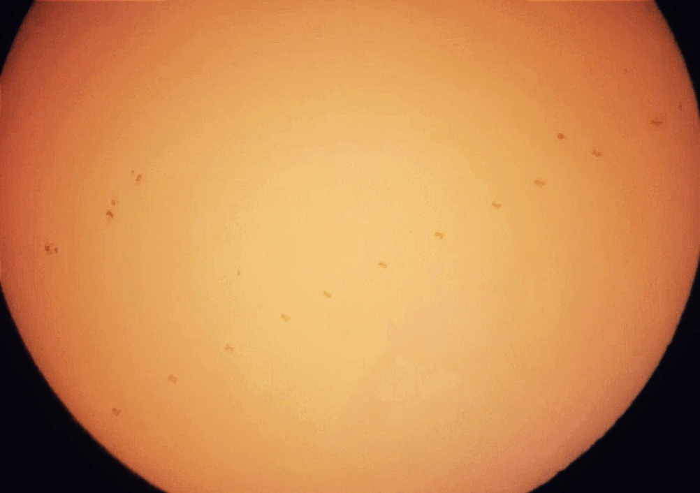 Salve a tutti, qui di seguito inserisco il mio primo tentativo di riprendere un passaggio della ISS sul disco solare. Avvenuto nel secondo e mezzo tre le 7:52 e 7:53 del 12 giugno e ripreso da casa col Dobson 8' Skywatcher, la ISS aveva le dimensioni angolari di 32''. Mi perdonerete la qualità ma essendo la prima ripresa avrò modo di arrivare a risultati più decenti.