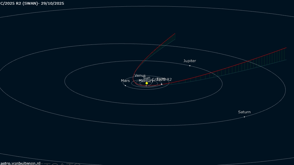 Come vi avevo promesso, ieri 28/10/2025 ho effettuato la ripresa in multi frame del viaggio della cometa C/2025 R2 (SWAN). Ho utilizzato diverse tecniche per allineare i frame e comporre la gif animata che è facilmente fruibile sui diversi dispositivi mutimediali Il grafico orbitale mostra il percorso della cometa attraverso il sistema solare e la sua posizione alla data indicata. Le linee verde e blu sono perpendicolari al piano dell'eclittica: verde se il percorso è sopra il piano dell'eclittica, blu se è sotto.Immaginatevi un viaggio lunghissimo affiancati ad una cometa..... Buona Visione.