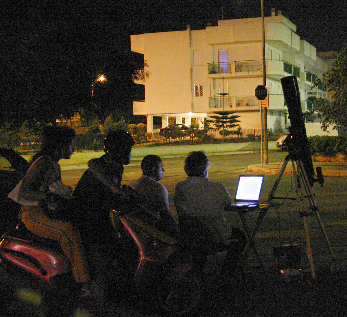 Prove strumentali dalla periferia di Polignano a Mare: il buon Riccardo (al notebook) verifica con una webcam modificata la precisione di inseguimento dell'EQ5 motorizzata, con sovrastante Celestron CR-6 150/1200mm (del sottoscritto), sotto lo sguardo attento dell'amicone Francesco di Putignano (BA). Non mancano i curiosi attratti dall'insolita presenza....