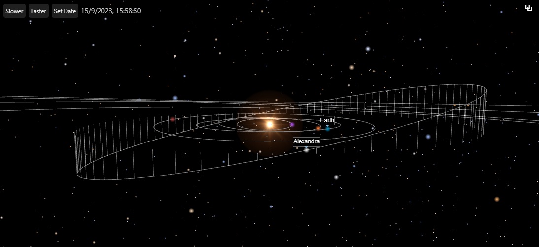 L' asteroide Alexandra misura circa 160 × 135 km, nella sua distanza massima dista piu' di tre volte la distanza tra Terra e Sole ed orbita intorno alla ns. stella in circa 1630 giorni ad una velocità di ben 17,91 chilometri al secondo.