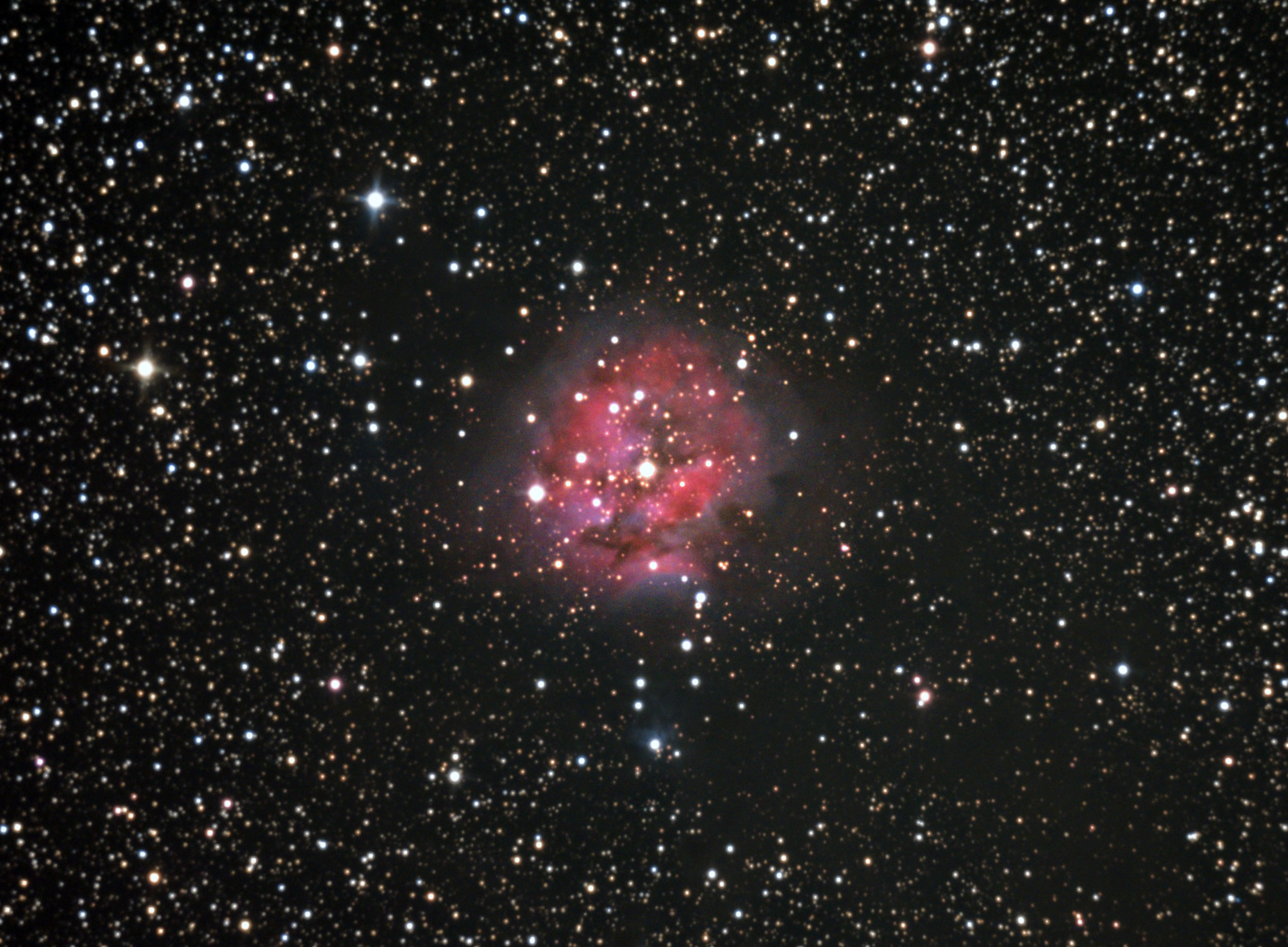 L'immagine non è a pieno formato, è stata tagliata per eliminare le zone periferiche, dove si vedeva una differenza di fondo cielo dovuta alla rotazione di campo. Con una montatura altazimutale come quella del dobson la rotazione di campo è inevitabile. L'immagine è stata elaborata senza l'ausilio di flat: nonostante ciò lo sfondo risulta uniforme, senza vignettature. Questo risultato è sempre dovuto al crop dell'immagine.