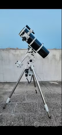 Montatura equatoriale EQ3 motorizzata su entrambi gli assi, utilizzata sempre nella configurazione come da foto e solo per visuale. Piccoli segni di usura, perfettamente funzionante, completa di pulsantiera, alimentatore, cannocchiale polare, 2 contrappesi e treppiedi in acciaio EQ5 originale.