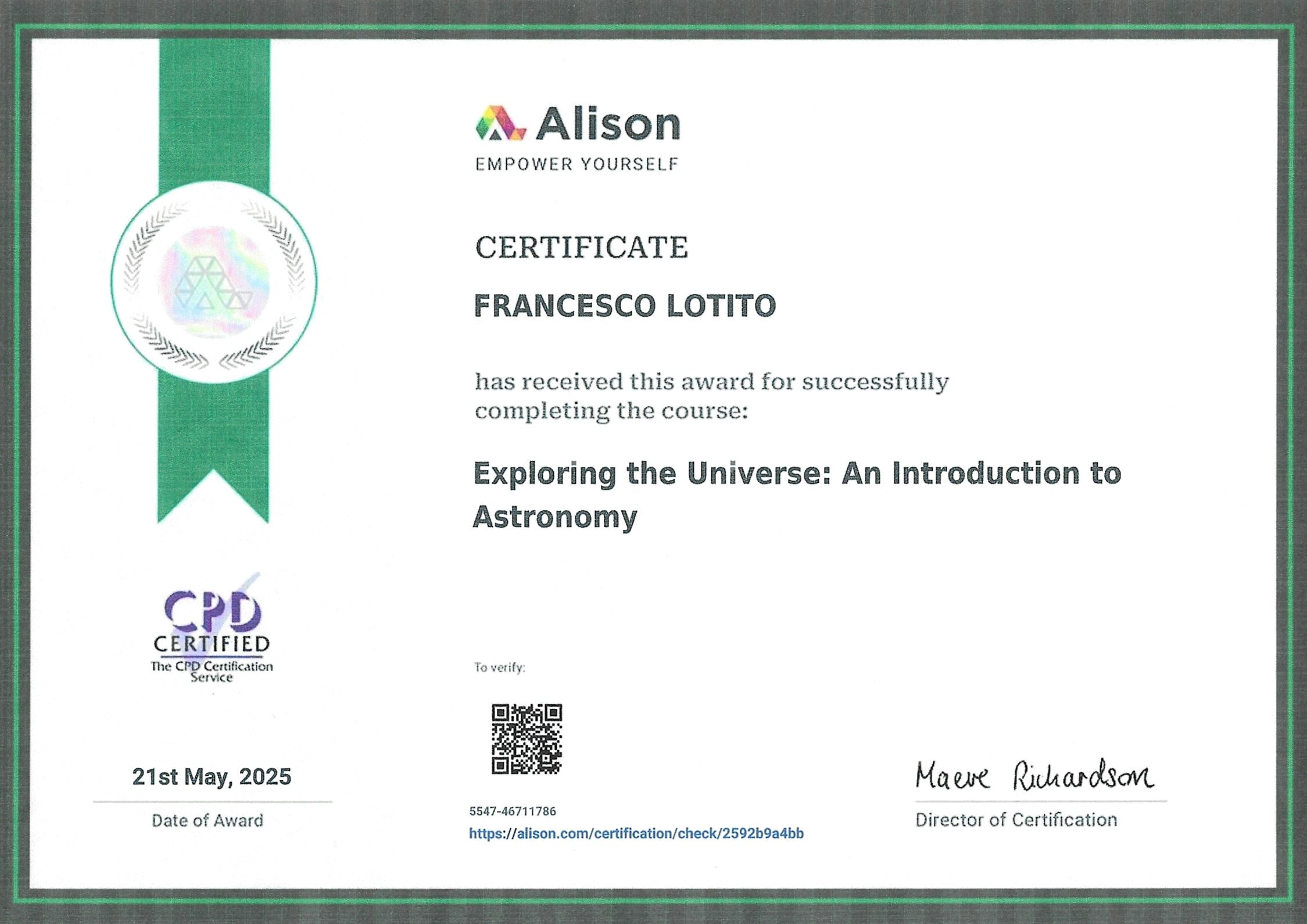 con grande entusiasmo e soddisfazione desidero condividere con voi un traguardo che mi sta particolarmente a cuore: ho completato con successo il corso online gratuito “Exploring the Universe: An Introduction to Astronomy” offerto da Alison Empower Yourself, conseguendo il relativo certificato.