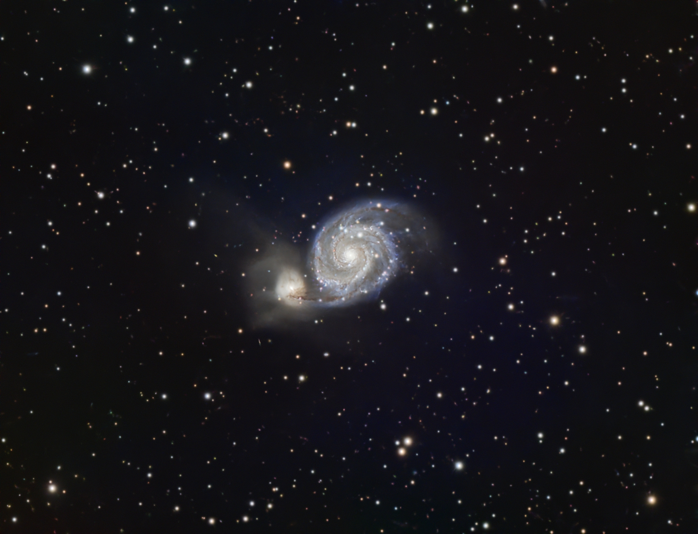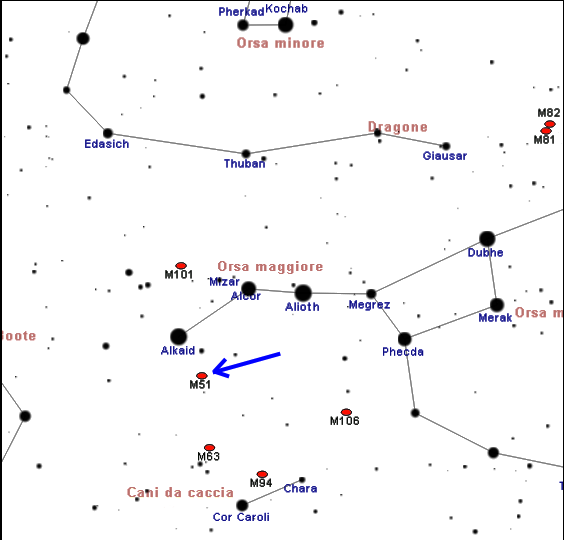 M 51 è un oggetto astronomico che comprende due galassie distinte, nella costellazione boreale dei Cani da Caccia: La più grande e famosa Galassia Vortice (anche nota come NGC 5194 ) è una classica galassia a spirale. La più piccola galassia compagna nota come NGC 5195 (o anche M51B), è parzialmente coperta da un braccio di polvere della spirale Vortice (con la quale interagisce).