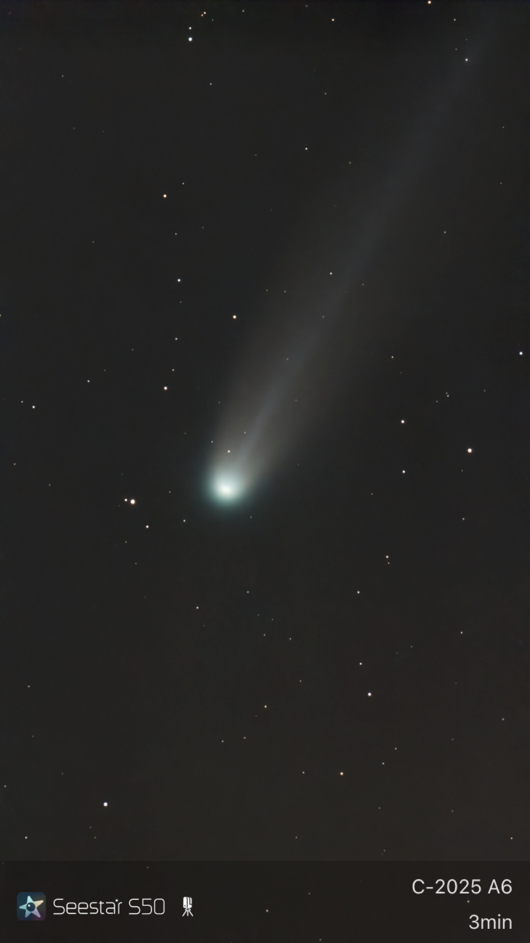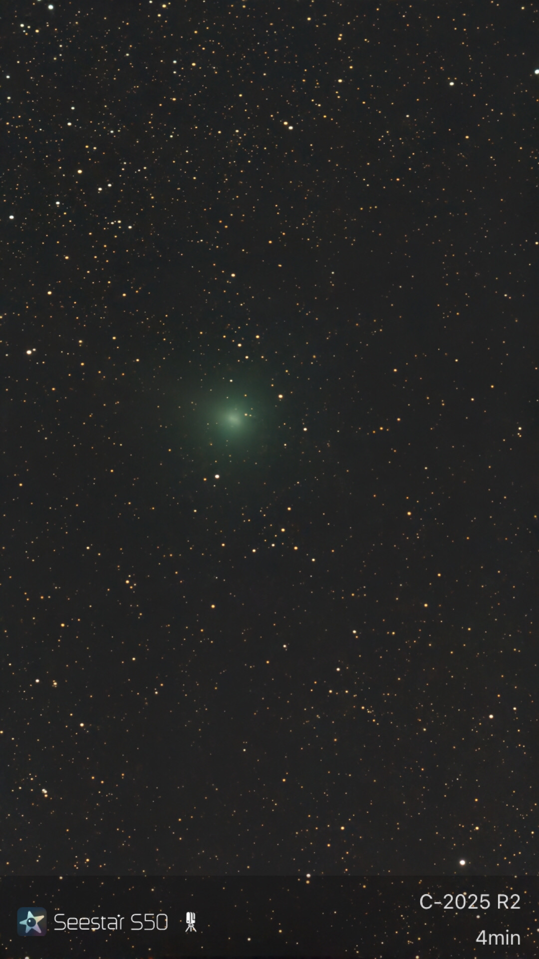 Mi inserisco con due dilettantesche immagini acquisite con il Seestar S50 della R2-Swan e della A6-Lemmon. Sono entrambe ottenute con scatti da 10 secondi per meno di 4/5 minuti per evitare distorsioni nel nucleo delle comete. Nessuna elaborazione esterna all'app Seestar. Riprese effettuate dal terrazzo a Palese (indovinate con che livello Bortle