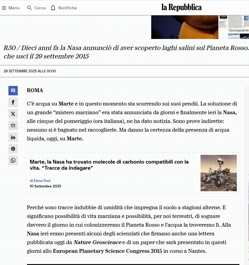 "C’è acqua su Marte e in questo momento sta scorrendo sui suoi pendii. La soluzione di un grande “mistero marziano” era stata annunciata da giorni e finalmente ieri la Nasa, alle cinque del pomeriggio (ora italiana), ne ha dato notizia. ... "